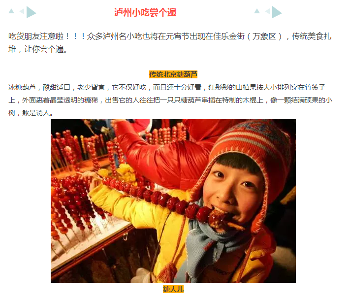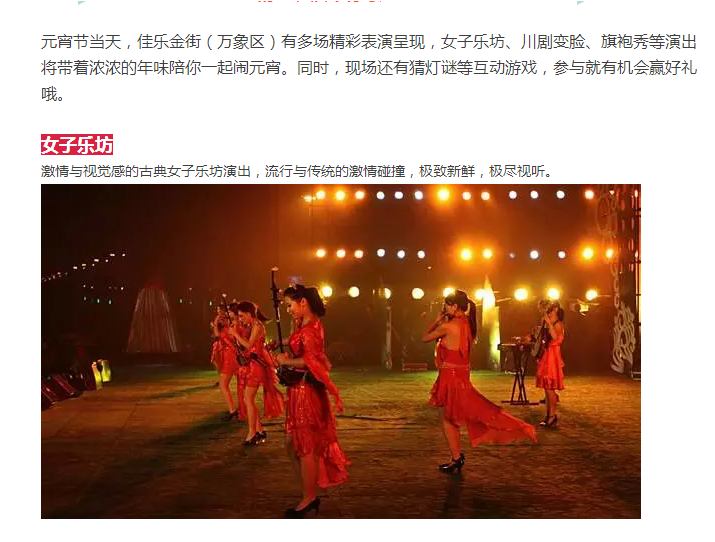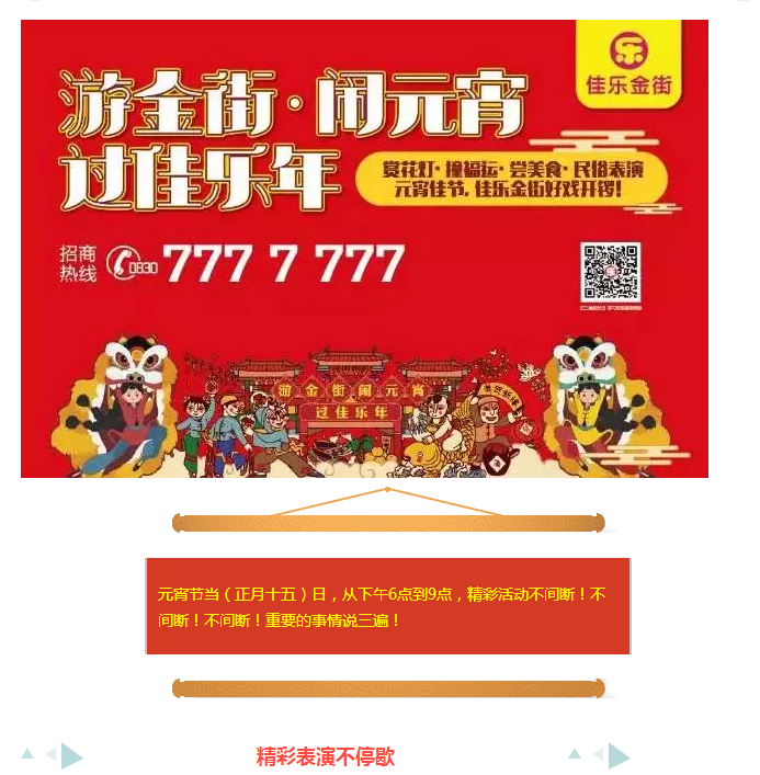 元宵佳节将至,佳乐金街(万象区)为各位亲准备了非常非常丰富的闹元宵活动,各种表演、趣味游戏、泸州名小吃、定时抽奖、商家大促,你还在等什么?闹元宵就到佳乐金街(万象区)哦!