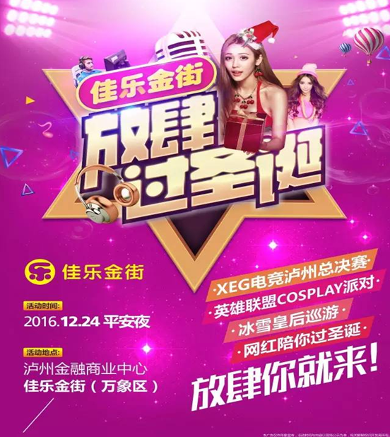 在万众期盼中,2016 XEG嘉年华泸州电竞总决赛将于平安夜在佳乐金街上演!届时电竞爱好者可参与比赛,也可到现场观看紧张刺激的电子竞技大赛!